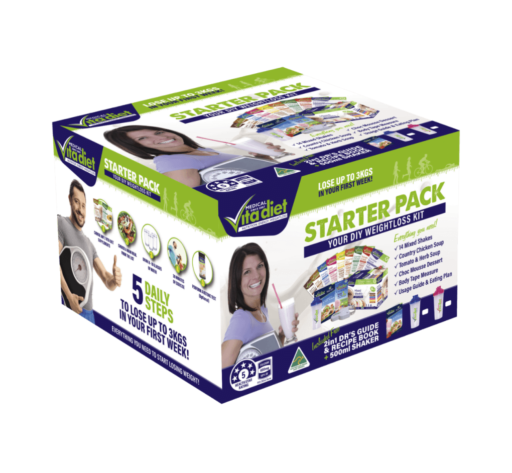 The Vita Diet DIY Starter Pack contains everything you need to start your weight loss journey including: 14 Assorted Shakes, 2 Soups, Dessert, 500ml Shaker, Complete Guide & Recipe Book, Body Tape Measure and Usage Guide.